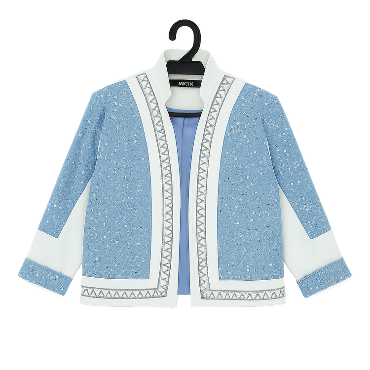 ترکیب پارچه جین آبی یخی با پولکهای ریز براق و دیزاین سفید، این کت رو به یه انتخاب متفاوت برای مهمونی، دورهمی یا حتی استایل روزمره تبدیل کرده.